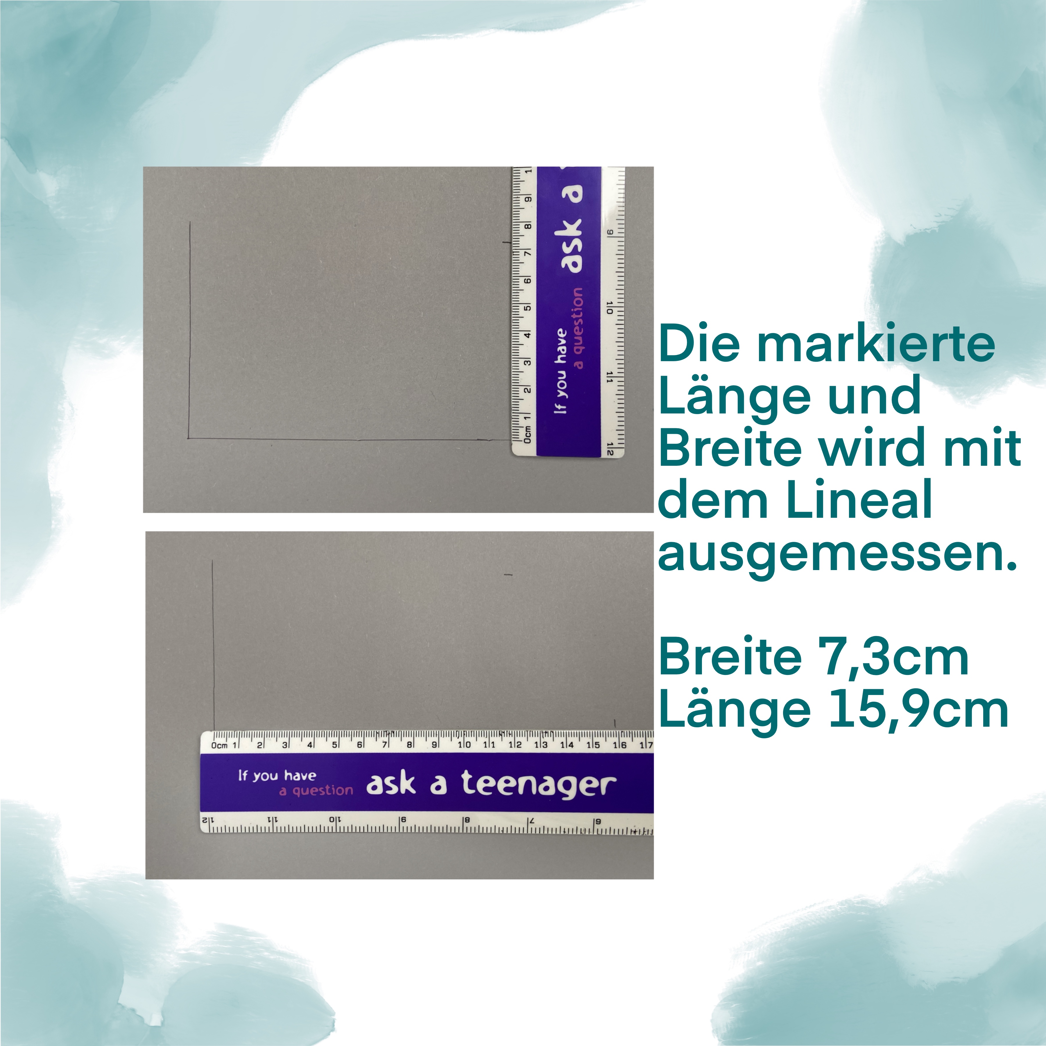 • Trage beide Maße in Zentimetern und mit einer Nachkommastelle ein (z. B. 13,4 cm / 6,2 cm).
